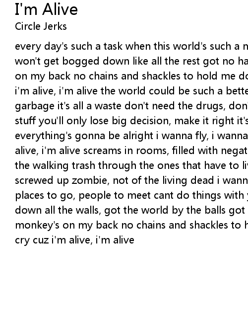 every day's such a task when this world's such a mess i try hard i do my best won't get bogged down like all the rest got no hampsters in my head, no monkey's on my back no chains and shackles to hold me down i wanna fly, i wanna fly cuz i'm alive, i'm alive the world could be such a better place who needs the garbage it's all a waste don't need the drugs, don't need the booze use that stuff you'll only lose big decision, make it right it's a battle, win the fight everything's gonna be alright i wanna fly, i wanna fly i'm alive, i'm alive, i'm alive, i'm alive screams in rooms, filled with negativity, filled with gloom all the walking trash through the ones that have to live like that not me, i'm no screwed up zombie, not of the living dead i wanna think, have a clear head places to go, people to meet cant do things with your head in the sheets tearing down all the walls, got the world by the balls got no hampsters in my head, no monkey's on my back no chains and shackles to hold me down i wanna laugh i wanna cry cuz i'm alive, i'm alive |