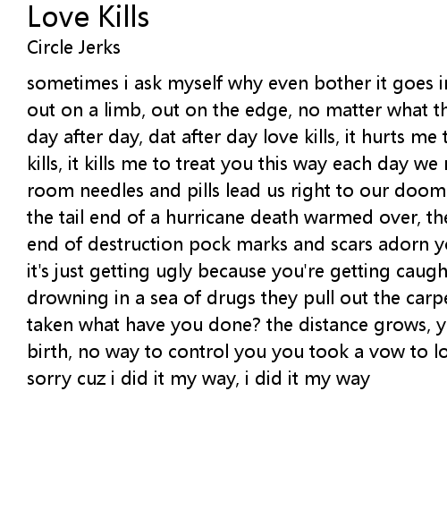 sometimes i ask myself why even bother it goes in one ear, right out the other out on a limb, out on the edge, no matter what they say the pleasure of pain, day after day, dat after day love kills, it hurts me to see you this way love kills, it kills me to treat you this way each day we rise with the sun in our room needles and pills lead us right to our doom, right to our doom looking like the tail end of a hurricane death warmed over, the rear end of destruction, rear end of destruction pock marks and scars adorn your face it used to be pretty but it's just getting ugly because you're getting caught up in a losing race. you're drowning in a sea of drugs they pull out the carpet, look at everything you've taken what have you done? the distance grows, you're fading away disturbed since birth, no way to control you you took a vow to love me forever never say you're sorry cuz i did it my way, i did it my way |