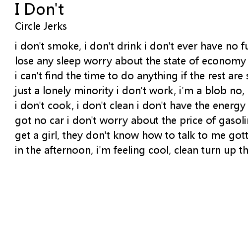 i don't smoke, i don't drink i don't ever have no fun anymore you see i don't lose any sleep worry about the state of economy the world's turning too slowly, i can't find the time to do anything if the rest are sharing something, i am just a lonely minority i don't work, i'm a blob no, i can't wake up and i won't i don't cook, i don't clean i don't have the energy for the scene and i don't got no car i don't worry about the price of gasoline news is coming on, i can't get a girl, they don't know how to talk to me gotta get up early, set the alarm in the afternoon, i'm feeling cool, clean turn up the heat |