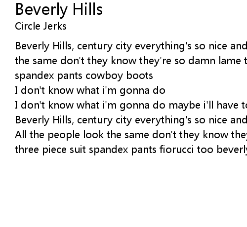 | Beverly Hills, century city everything's so nice and pretty all the people look the same don't they know they're so damn lame there she goes three piece suit spandex pants cowboy boots | |