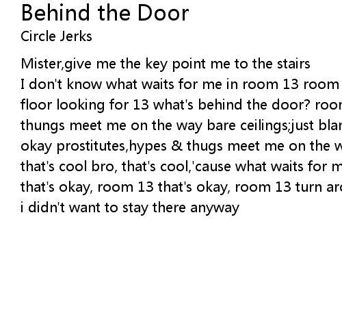 I don't know what waits for me in room 13 room 13 dim lit stairway stains on the floor looking for 13 what's behind the door? room 13 room 13 prostitutes,hypes & thungs meet me on the way bare ceilings;just blank walls blank walls, that's okay prostitutes,hypes & thugs meet me on the way empty bottles,spots of blood that's cool bro, that's cool,'cause what waits for me? a whore,a bullet a thug? that's okay, room 13 that's okay, room 13 turn around i'll walk away turn around i didn't want to stay there anyway |