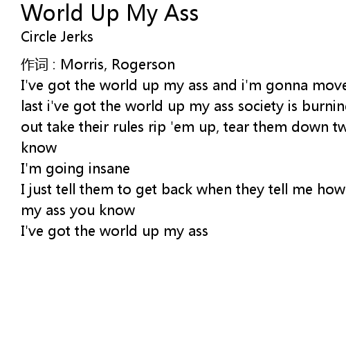 | I' ve got the world up my ass and i' m gonna move fast be the first won' t be the last i' ve got the world up my ass society is burning me up take a bite, spit it out take their rules rip ' em up, tear them down twisted mind, withered brain you know | |