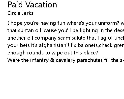 | I hope you're having fun where's your uniform? where's your gun? better rub up that suntan oil 'cause you'll be fighting in the desert it's not..vietnam just another oil company scam salute that flag of uncle sam get your money out place your bets it's afghanistan!! fix baionets,check grenades got enough bullets got enough rounds to wipe out this place? | |