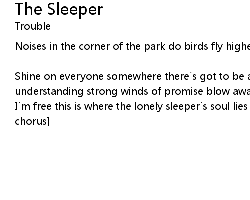 | Noises in the corner of the park do birds fly higher in the dark scenes of unopened eyes - goodbye this is where the lonely sleeper`s soul lies [Chorus] | |
