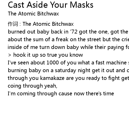 | burned out baby back in '72 got the one, got the one > are you done, fuck you about the sum of a freak on the street but the cries of the lies calling out inside of me turn down baby while their paying for you got the one > got the one > hook it up so true you know | |