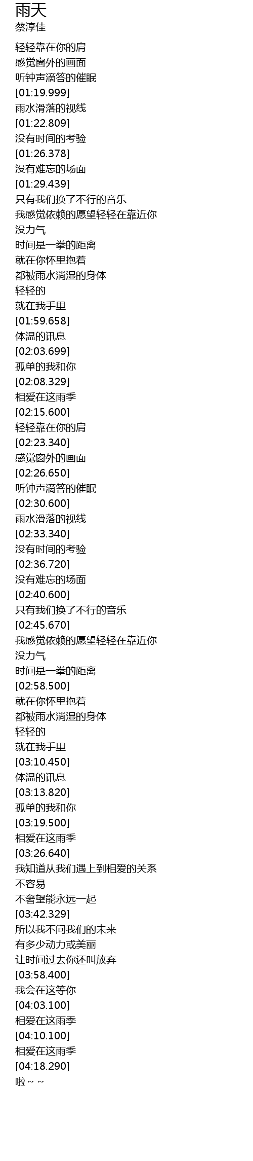 | [04:11.750] | xiāng ài zài zhè yǔ jì |