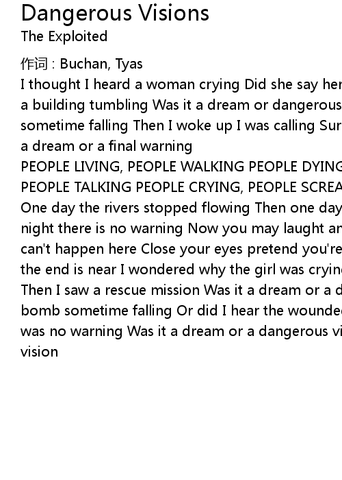 | One day the rivers stopped flowing Then one day the grass stopped growing All is night there is no warning Now you may laught and you may sneer Can' t come true can' t happen here Close your eyes pretend you' re blind But what will you do when the end is near I wondered why the girl was crying Then I saw her parents dying Then I saw a rescue mission Was it a dream or a dangerous vision Did I see a bomb sometime falling Or did I hear the wounded calling All is darkness there was no warning Was it a dream or a dangerous vision Was it a dream of dangerous vision |