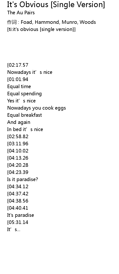 | [01:36.16][03:11.96][05:14.35][05:27.99][05:34.61] | It' s obvious it' s obvious |