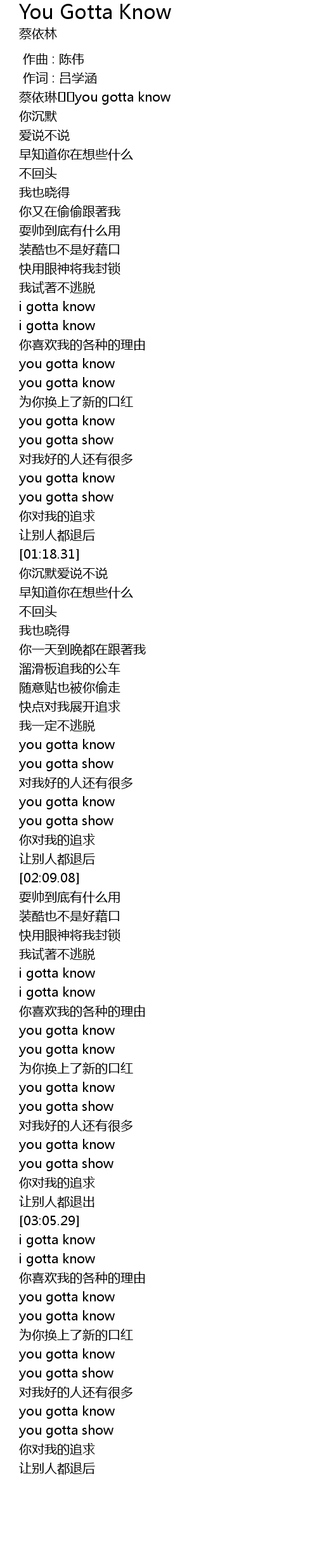 | [00:01.33] | 蔡依琳��you gotta know |