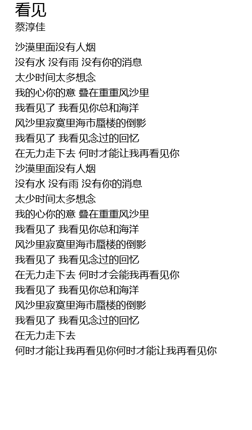 | [00:56.03] | wǒ kàn jiàn le wǒ kàn jiàn nǐ zǒng hé hǎi yáng |