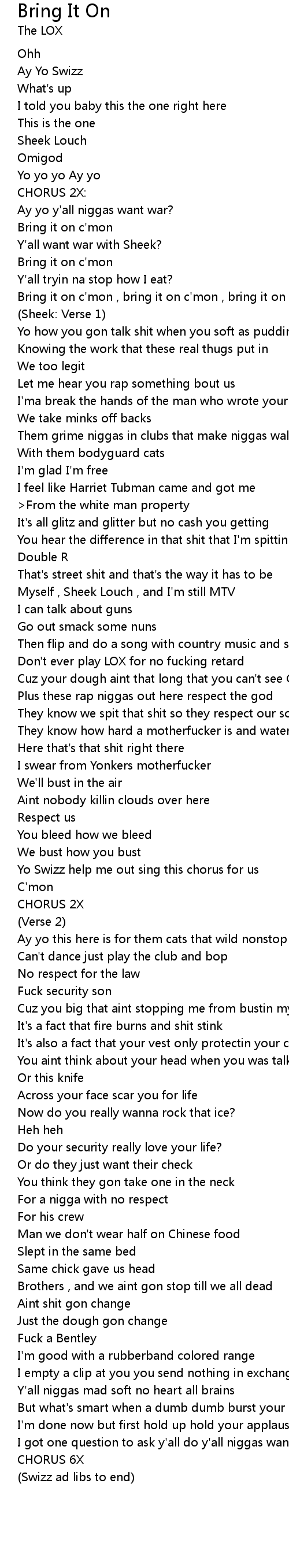 Bring it on c'mon , bring it on c'mon , bring it on c'mon |