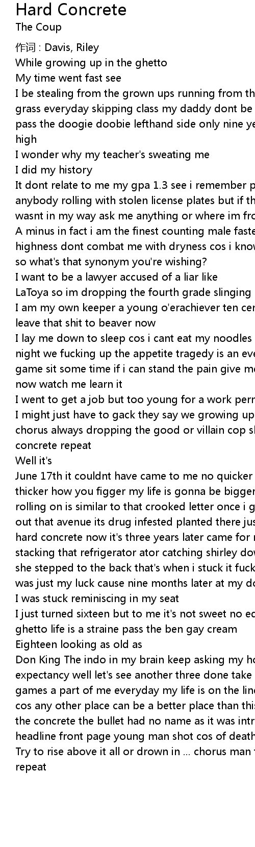 | I might just have to gack they say we growing up fast but we just dying faster chorus always dropping the good or villain cop slam the child on the hard concrete repeat | |