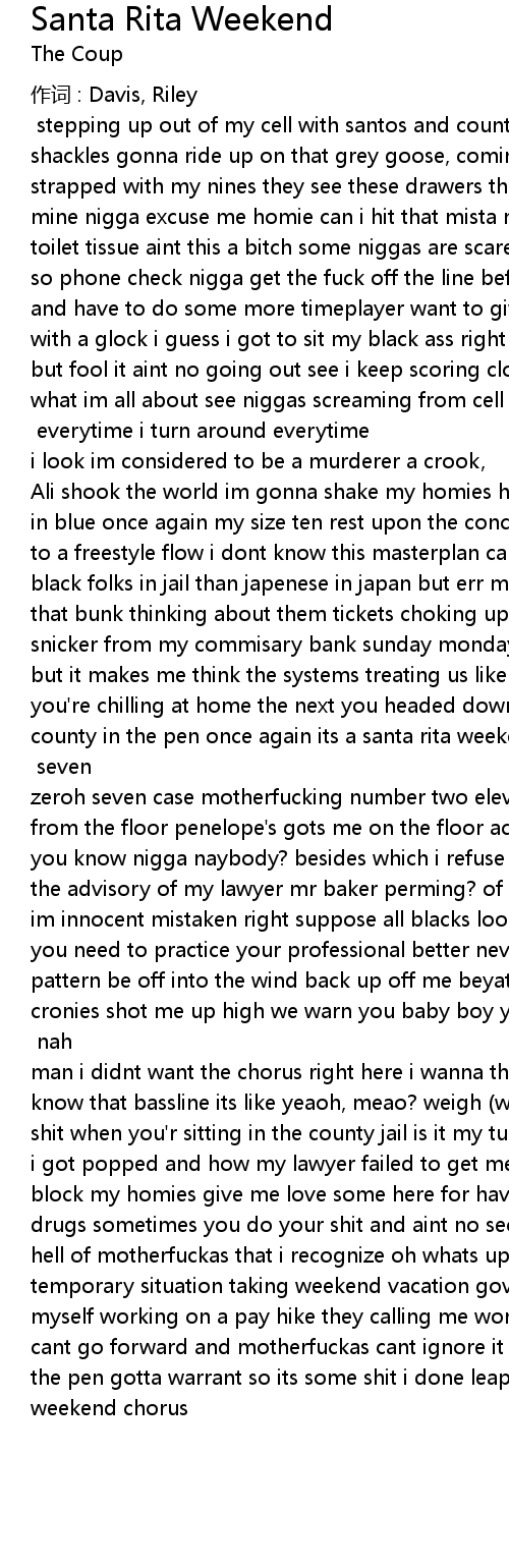 | X just sitting up on the top bunk watching the cell block row. E40 seven zeroh seven case motherfucking number two eleven stressing manifestin tore up from the floor penelope' s gots me on the floor accused of robbing a store who you know nigga naybody? besides which i refuse to answer any questions without the advisory of my lawyer mr baker perming? of this wall i make let me go po po im innocent mistaken right suppose all blacks look alike thank you kindly sir you need to practice your professional better never run up on me again bust a pattern be off into the wind back up off me beyatch just the other day my cronies shot me up high we warn you baby boy you becoming hella tight clayback back a building up there by dreno, rita, quentin also gino chorus Boots nah man i didnt want the chorus right here i wanna throw that right down there you know that bassline its like yeaoh, meao? weigh wait two scales it dont mean shit when you' r sitting in the county jail is it my turn to tell the tale of how i got popped and how my lawyer failed to get me out on the slight spot cell block my homies give me love some here for having gacks some here for selling drugs sometimes you do your shit and aint no second tries look around theres hell of motherfuckas that i recognize oh whats up man im back again but its a temporary situation taking weekend vacation government incaceration i call myself working on a pay hike they calling me working on my third strike sike i cant go forward and motherfuckas cant ignore it cos all my peoples on parole in the pen gotta warrant so its some shit i done leaped in damn another santa rita weekend chorus |