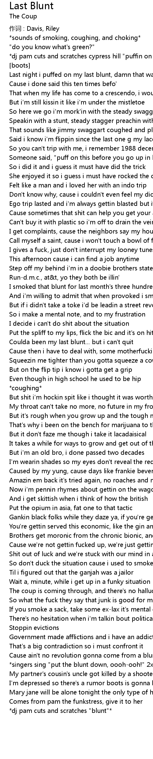 | Last night i puffed on my last blunt, damn that was a stupid stunt | |