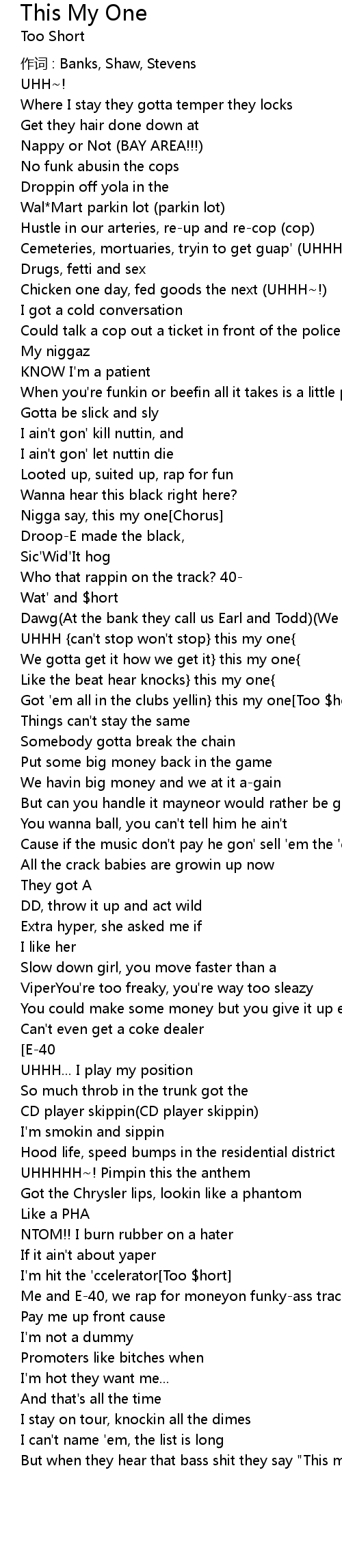 | Got 'em all in the clubs yellin} this my one[Too $hort] | |