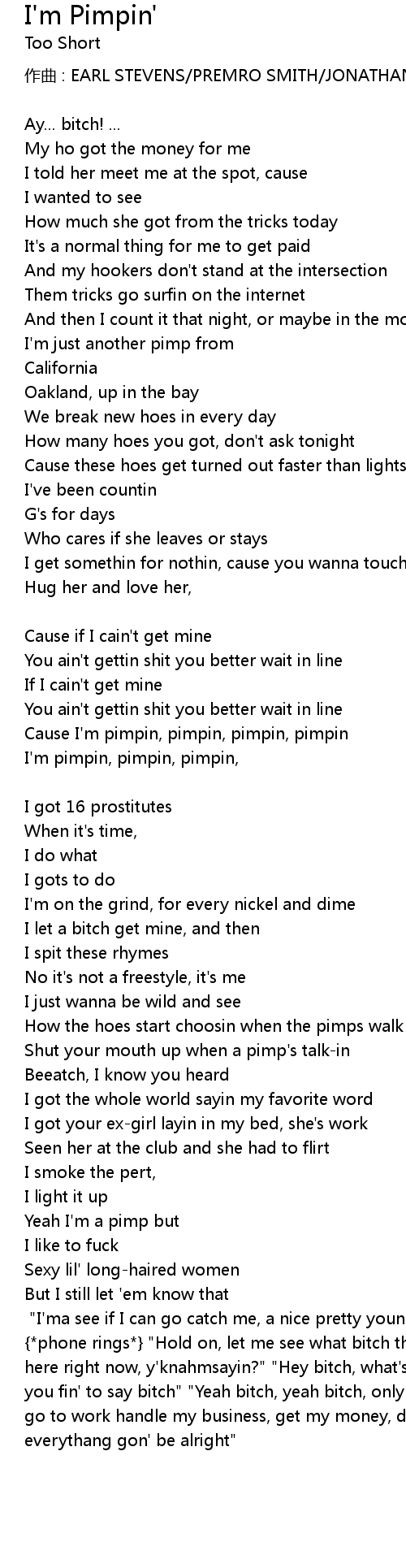 | I' m pimpin Chorus " I' ma see if I can go catch me, a nice pretty young bitch" phone rings " Hold on, let me see what bitch that is" " Okay this the bitch here right now, y' knahmsayin?" " Hey bitch, what' s happenin? I already know what you fin' to say bitch" " Yeah bitch, yeah bitch, only thang you do bitch, is just go to work handle my business, get my money, don' t give me no problems, everythang gon' be alright" |