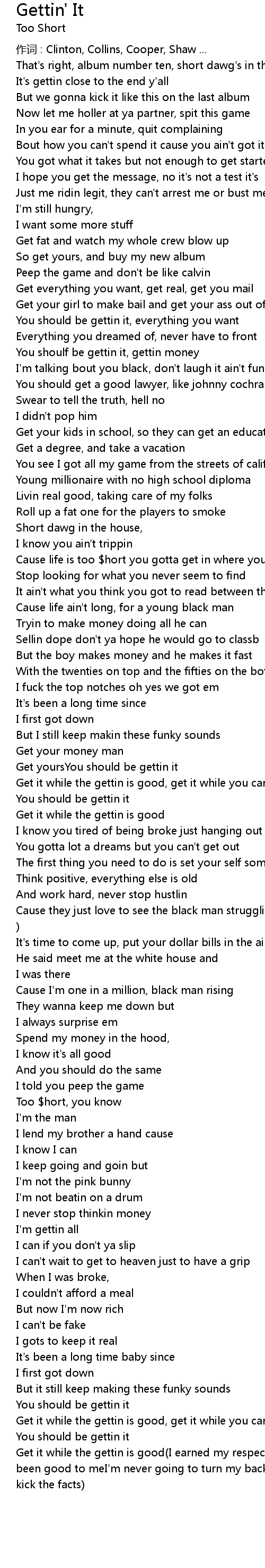 | Get it while the gettin is good(I earned my respect in the streetThe ghetto's been good to meI'm never going to turn my backThe true and living so I got to kick the facts) |