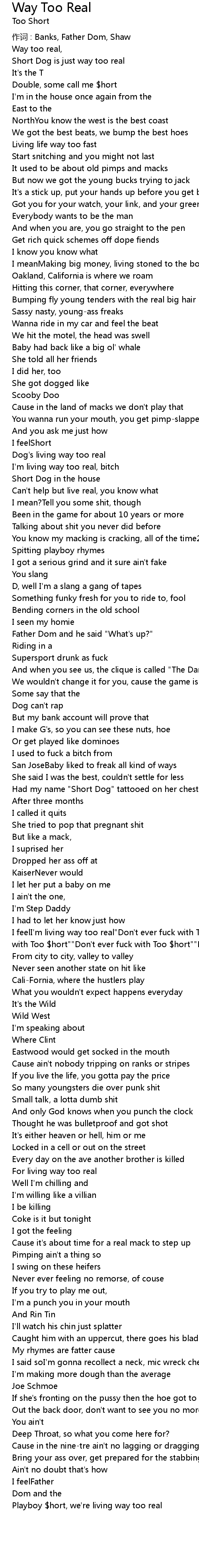 | I feelI'm living way too real"Don't ever fuck with Too $hort""Don't ever fuck with Too $hort""Don't ever fuck with Too $hort""Don't ever fuck with Too $hort" | |