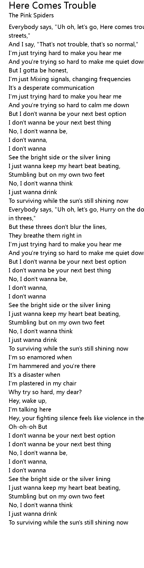 Everybody says, "Uh oh, let's go, Here comes trouble, There's sirens in the streets," |