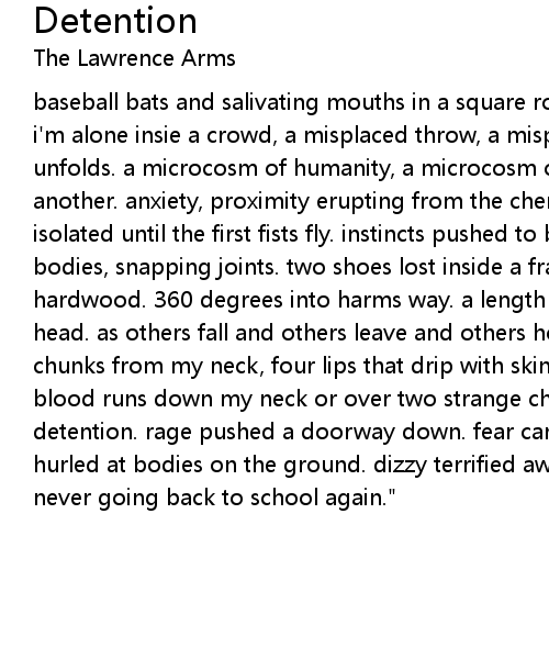 baseball bats and salivating mouths in a square room, doors pocked. once again i'm alone insie a crowd, a misplaced throw, a misplaced swing and everything unfolds. a microcosm of humanity, a microcosm of cold ... the waves wash over another. anxiety, proximity erupting from the chemistry of testosterone, isolated until the first fists fly. instincts pushed to breaking points, surging bodies, snapping joints. two shoes lost inside a fray, two socks on laminated hardwood. 360 degrees into harms way. a length of lead grazed the side of my head. as others fall and others leave and others how their vampire teeth. two chunks from my neck, four lips that drip with skin, socks that slide as the blood runs down my neck or over two strange chins. there is no way out of detention. rage pushed a doorway down. fear carried me past the last contusions hurled at bodies on the ground. dizzy terrified awake in sweaty skin, "mom, i'm never going back to school again." |