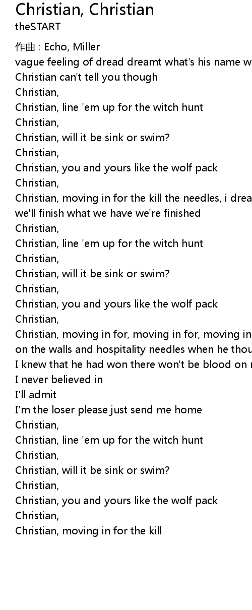 | Christian, moving in for the kill the needles, i dream of keeping them so clean we' ll finish what we have we' re finished | |