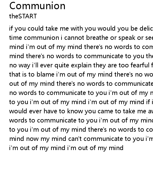 if you could take me with you would you be delicate with me? this is my first time communion i cannot breathe or speak or see i'm out of my mind i'm out of my mind i'm out of my mind there's no words to communicate to you i'm out of my mind there's no words to communicate to you there are no words for what you are no way i'll ever quite explain they are too fearful for reason only the veil that is to blame i'm out of my mind there's no words to communicate to you i'm out of my mind there's no words to communicate to you i'm out of my mind there's no words to communicate to you i'm out of my mind no, my mind, yeah, communicate to you i'm out of my mind i'm out of my mind if i could stay here forever no-one would ever have to know you came to take me away i'm out of my mind there's no words to communicate to you i'm out of my mind there's no words to communicate to you i'm out of my mind there's no words to communicate to you i'm out of my mind now my mind can't communicate to you i'm out of my mind i'm out of my mind i'm out of my mind i'm out of my mind |