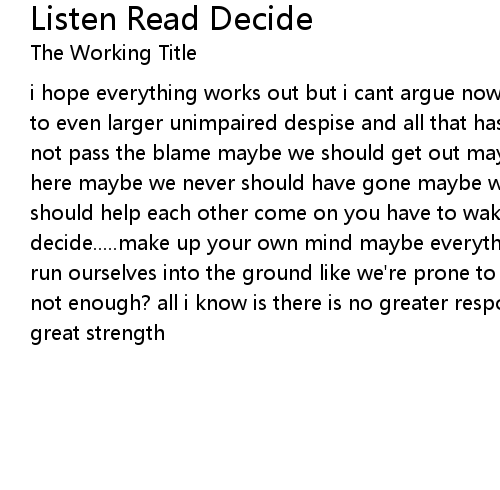 i hope everything works out but i cant argue now we have opened up large doors to even larger unimpaired despise and all that has taken so many lives we can not pass the blame maybe we should get out maybe theres other things we could do here maybe we never should have gone maybe we did the right thing maybe we should help each other come on you have to wake up, listen, read, decide.....make up your own mind maybe everything takes time maybe we'll just run ourselves into the ground like we're prone to do are we thinking too much or not enough? all i know is there is no greater responsibility than comes with great strength |