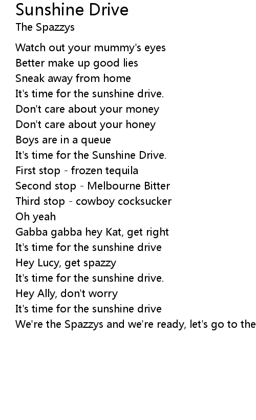 We're the Spazzys and we're ready, let's go to the sunshine drive |