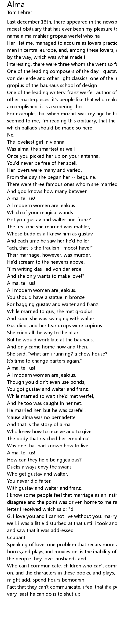 | Last december 13th, there appeared in the newspapers the juiciest, spiciest, raciest obituary that has ever been my pleasure to read. it was that of a lady name alma mahler gropius werfel who ha | |