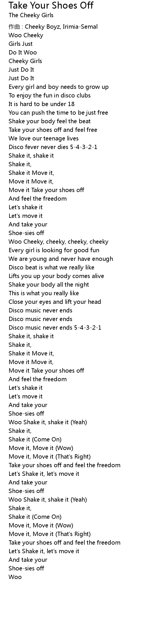 | Song | Take Your Shoes Off |
