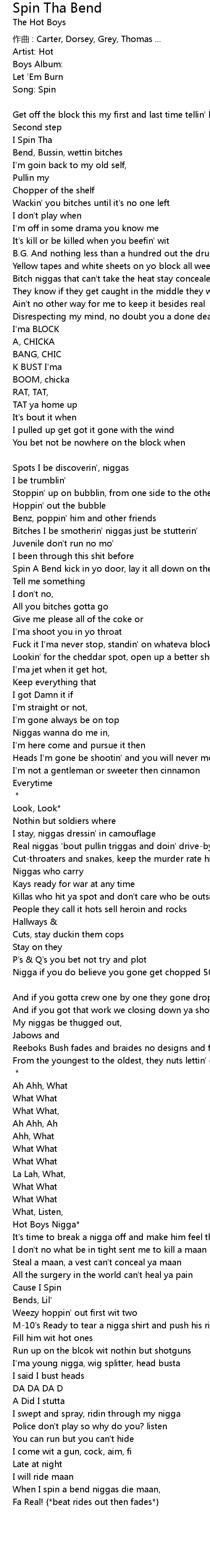 | Spin Yo Bend like a dryer takin you off yo block nigga Verse 4: Lil Wayne | |