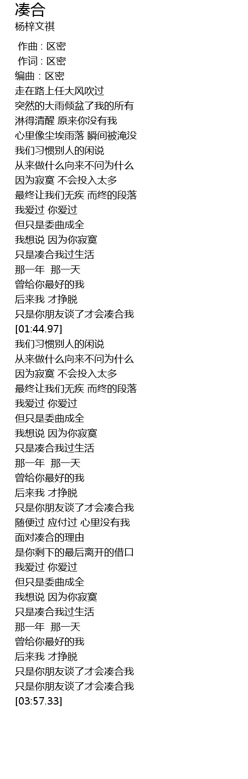 | [03:45.94] | 只是你朋友谈了才会凑合我 |