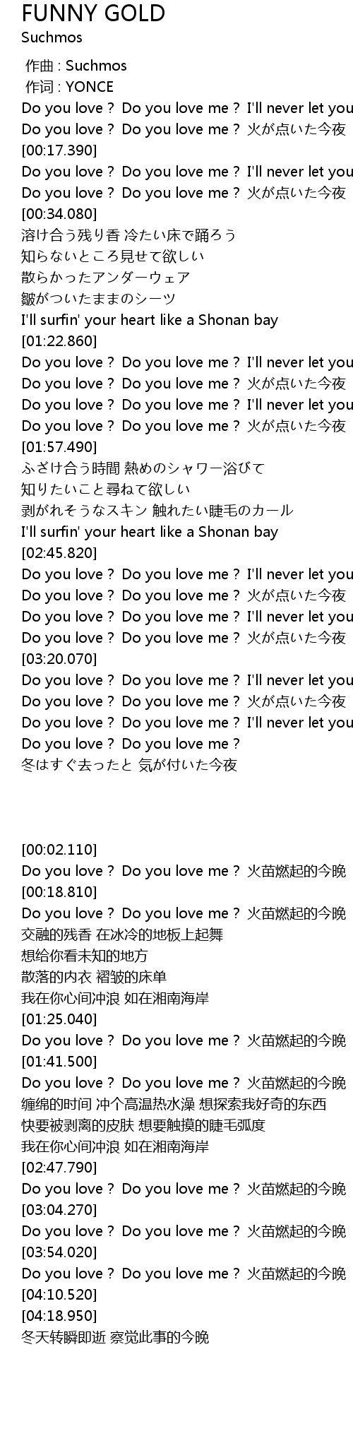 | [00:10.480] | Do you love? Do you love me? huǒ diǎn jīn yè |