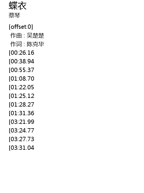 | [02:13.05][00:26.16] | 被你轻轻揭去 我那美丽的蝶衣 |