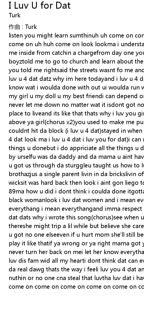 | listen you might learn sumthinuh uh come on come on uh yeah yea yeah yeahcome on come on uh huh come on look lookma i understand why you used to be so hardkept me inside from catchin a chargefrom day one you always said i aint had no boyztold me to go to church and learn about the lawya never... told me wrong but you told me rightsaid the streets wasnt fo me and i'll lose my lifelook here i luv u 4 dat datz why im here todayand i luv u 4 dat look i mean wat i sayi dont know wat i woulda done with out ui woulda run wid a gun probally with out uyou my girl u my doll u my best friendi can depend on you mama again and againyou never let me down no matter wat it isdont got no where to go you would give me a place to liveand its like that thats why i luv you girli would never put no one above ya girl(chorus x2)you used to make me punch da clock (i luv u 4 dat)i couldnt hit da block (i luv u 4 dat)stayed in when it was hot (look here i luv u 4 dat look ma i luv u 4 dat i luv you for dat)i can never pay u back for all the things u donebut i do appriciate all the things u donetakin care of 3 sons all by urselfu was da daddy and da mama u aint have no helpwhen times was ruff fo us u got us through da sturggleu taught us how to luv one an other and be brothazjus a single parent livin in da brickslivin off welfare food stamps and wicksit was hard back then look i aint gon liego to skoo then be back in before 89ma how u did i dont think i coulda done itgotta give u ya props u a strong black womanlook i luv dat women and i mean everythangwhen i say she mean everythang i mean everythangand imma respect her till she dead n gonei luv u for dat dats why i wrote this song(chorus)see when u go to jail mom still be thereshe might trip a lil while but believe she carealways by ya side dawg when u got no one elseeven if u hurt mom she'll still be therei dont know no body who play it like thatif ya wrong or ya right mama got ya backshe 100 wid me she'll never turn her back on mei let her know everythang cuz itz like she my hommiei luv dis fam wid all my hearti dont think dat can even take us apartand dats on da real dawg thats the way i feeli luv you 4 dat and im just keepin it realand nuthin or no one cna steal that luvtha luv dat i have for my mamacome on come on come on come on come on come on come on come on come on(chorus) |