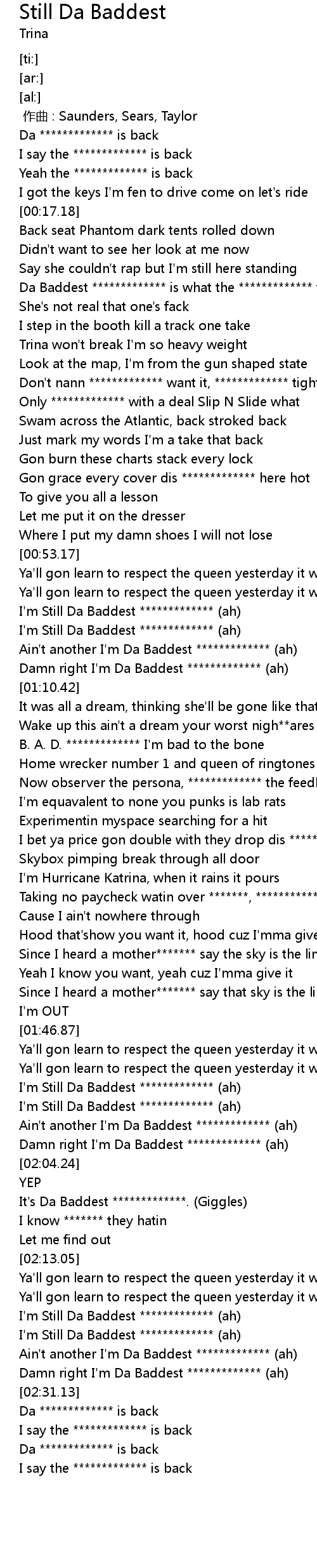 | [02:02.06] | Damn right I'm Da Baddest ************* (ah) |