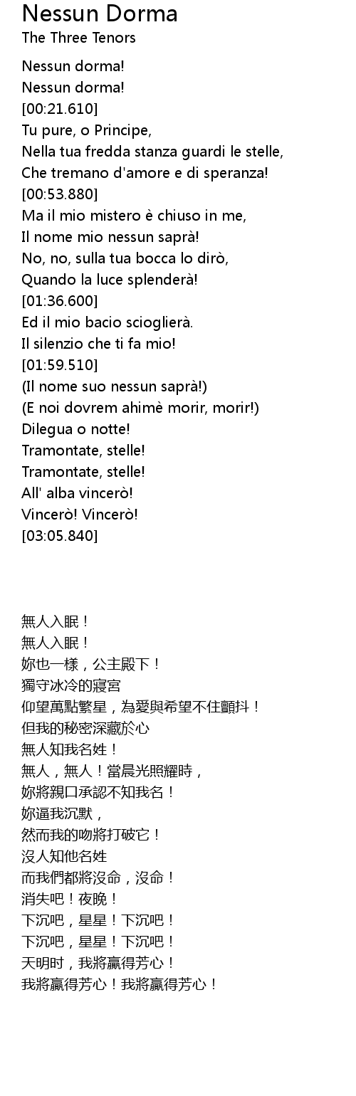 | [02:03.470] | (Il nome suo nessun saprà!) |