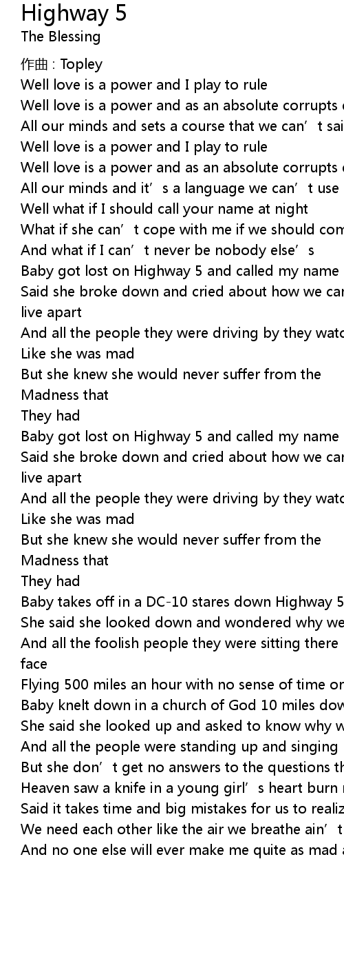 | Baby got lost on Highway 5 and called my name out loud | |