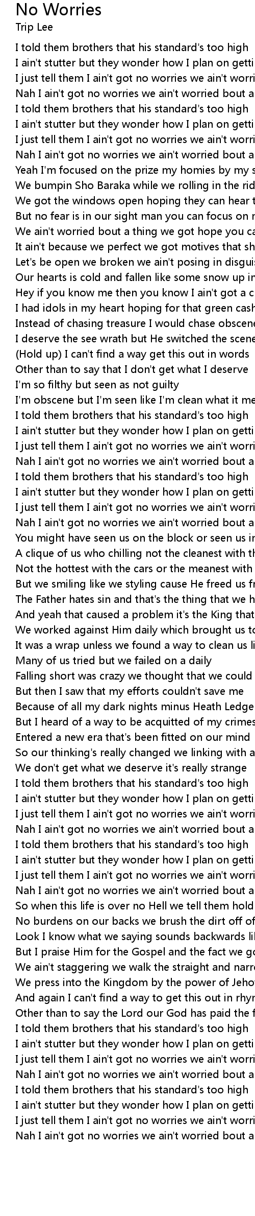 I just tell them I ain't got no worries we ain't worried bout a thing |