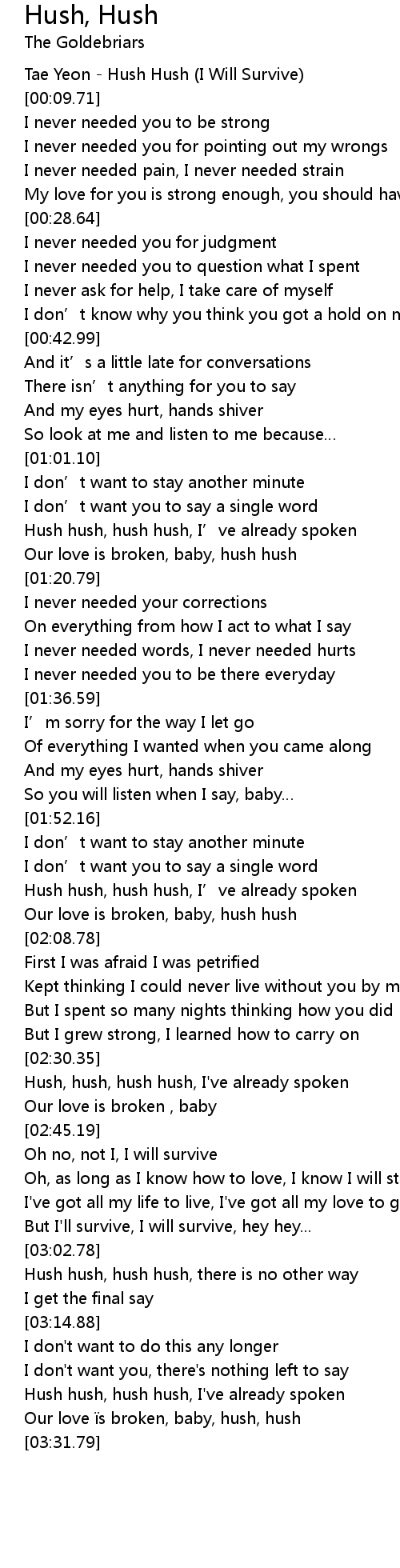 | [00:01.16] | Tae Yeon Hush Hush I Will Survive |