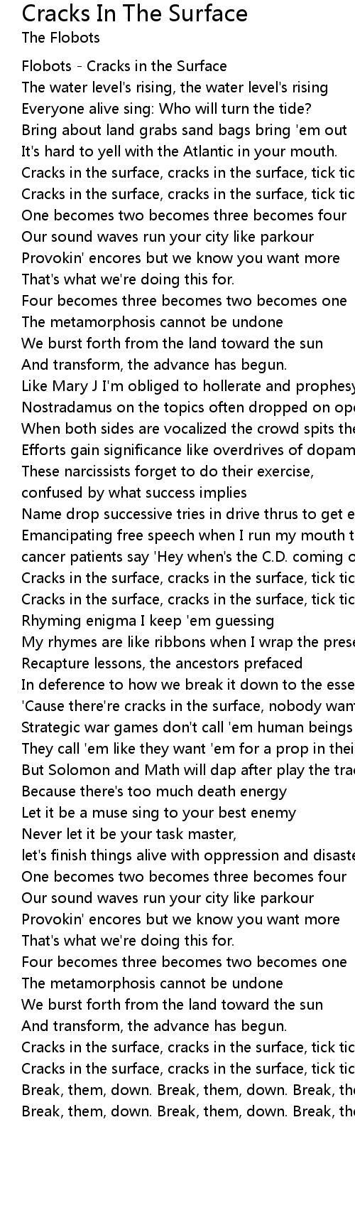 Cracks in the surface, cracks in the surface, tick tick tick tick. |