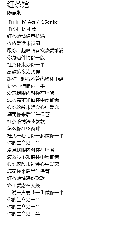 | [00:43.910] | hóng chá bēi lái fēn nǐ yī bàn |
