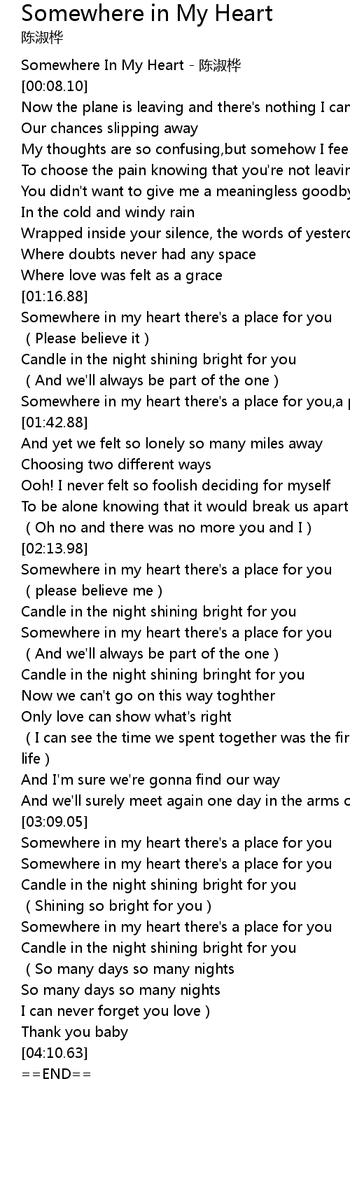 | [03:45.85] | Somewhere in my heart there's a place for you |