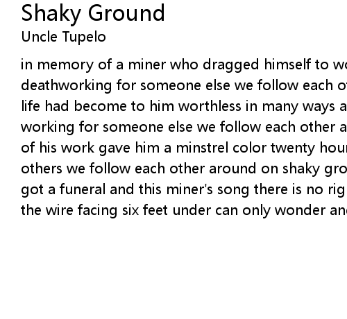 in memory of a miner who dragged himself to work and worked himself to deathworking for someone else we follow each other around on shaky ground his life had become to him worthless in many ways an expired product off the shelf working for someone else we follow each other around on shaky ground the nature of his work gave him a minstrel color twenty hours a day little time he had for others we follow each other around on shaky ground never got to see the world he got a funeral and this miner's song there is no right or wrong now it's down to the wire facing six feet under can only wonder and stare his name was a number |