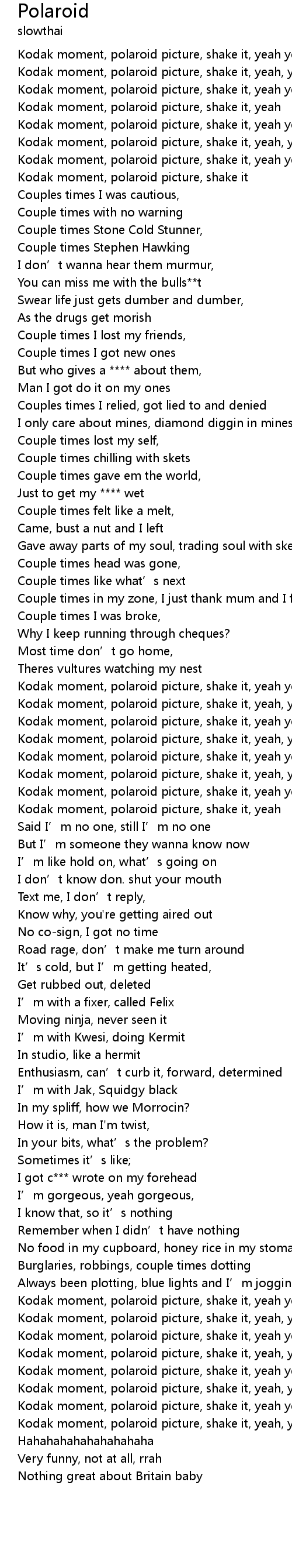 | [00:03.45] | Kodak moment, polaroid picture, shake it, yeah, yeah |