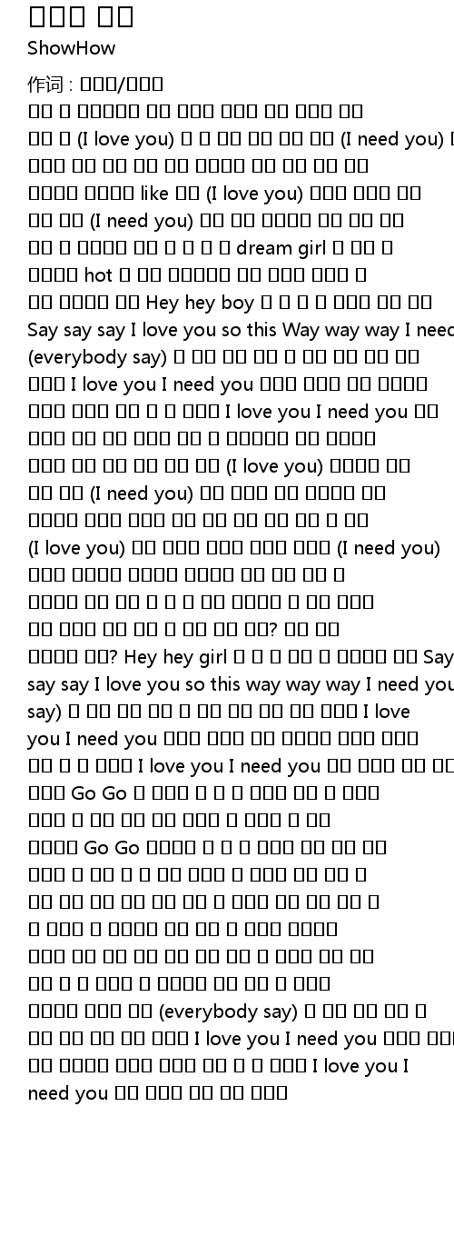 사실 난 어제까지만 해도 너와의 이별을 생각 했는데 바보 같이 또 (I love you) 왜 이 말이 튀어 나온 건지 (I need you) 너 없이는 안되 겠는 건지 너도 알다시피 우린 그리 깊지 않은 로맨스로 시작됐지 like 집시 (I love you) 하지만 너에게 말해 버린 거지 (I need you) 정말 내가 미쳐버린 건지 다시 다시 다시 나 생각해도 말야 넌 내 내 내 dream girl 이 아냐 난 샤방하고 hot 한 모델 스타일이란 말야 그런데 이상해 널 보면 설레인단 말야 Hey hey boy 왜 왜 왜 난 그녀만 보면 그냥 Say say say I love you so this Way way way I need you now and day by day (everybody say) 그 많은 예쁜 여자 들 중에 나는 너만 보여 완벽해 I love you I need you 천천히 다가가 편한 친구로는 부족해 어디를 가도 난 널 생각해 I love you I need you 이제 말할게 나는 너만 사랑해 사실 난 이전까지만 해도 누군가를 이렇게 길게 만난 적이 없는 데도 (I love you) 너에게는 이런 말을 하고 (I need you) 네가 없으면 괜히 심심하고 그냥 친구라고 가볍게 만나고 잠깐 잠깐 커피 한잔 하고 또 가고 (I love you) 다른 연인들 데이트 같지도 않았고 (I need you) 심지어 커피만큼 뜨겁지도 않았잖아 다시 다시 다시 너 생각하란 말야 전에 내 내 내 내게 말했잖아 나 같은 남자는 힘들 거라고 라고 근데 왜 나를 막지 않니? 설마 그냥 만나주는 거니? Hey hey girl 왜 왜 왜 이런 날 믿어주는 거니 Say say say I love you so this way way way I need you now and day by day (everybody say) 그 많은 예쁜 여자 들 중에 나는 너만 보여 어떻게 I love you I need you 천천히 다가가 편한 친구로는 부족해 어디를 가도 난 널 생각해 I love you I need you 이제 말할게 나는 너만 사랑해 Go Go 널 향해서 또 또 널 위해서 내가 널 위해서 보여줄 수 있게 다가 갈게 느리게 또 느리게 널 향해 걸어갈게 Go Go 기다려줘 또 또 날 믿어줘 나를 웃음 짓게 만드는 이 세상 단 한 사람 느리게 또 느리게 보여 줄래 내 사랑 하나 둘씩 서로 다가 왔던 맘 느리게 걷다 서로 느낀 그 맘 어느새 네 목소리에 잠이 드는 밤 어색한 입맞춤도 행복한 사람 하나 둘씩 서로 다가 왔던 맘 느리게 걷다 서로 느낀 그 맘 어느새 네 목소리에 잠이 드는 밤 어색한 입맞춤도 행복한 사람 (everybody say) 그 많은 예쁜 여자 들 중에 나는 너만 보여 어떻게 I love you I need you 천천히 다가가 편한 친구로는 부족해 어디를 가도 난 널 생각해 I love you I need you 이제 말할게 나는 너만 사랑해 |