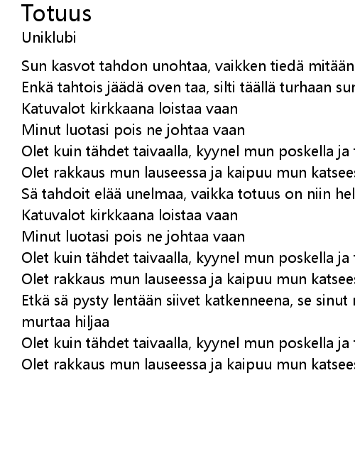 | Olet kuin t hdet taivaalla, kyynel mun poskella ja tahtoisin lent sun luo | |
