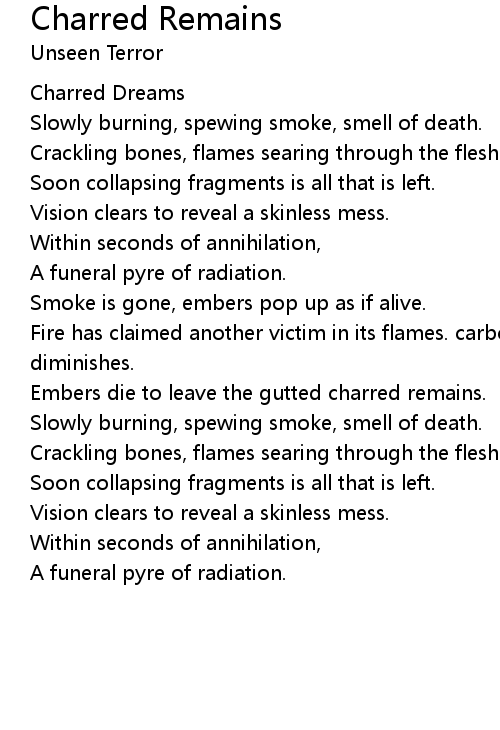 Fire has claimed another victim in its flames. carbon covered smouldered corpse diminishes. |