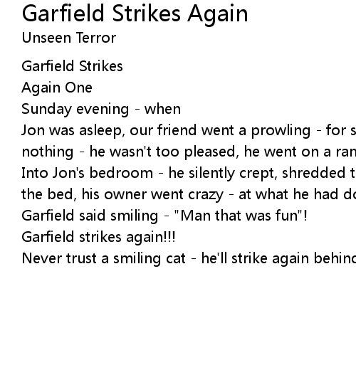 | Jon was asleep, our friend went a prowling - for something to eat, when he found nothing - he wasn't too pleased, he went on a rampage - to put mind at ease! | |
