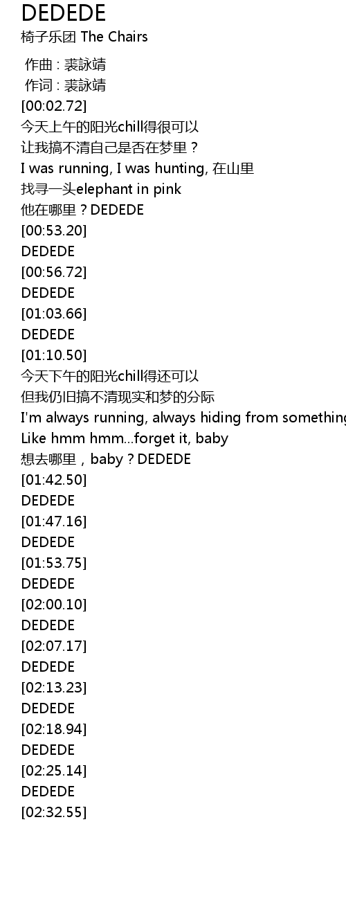 | [00:45.81] | tā zài nǎ lǐ? DEDEDE |